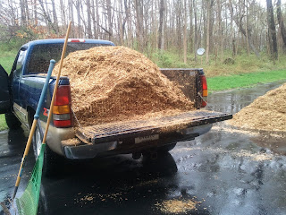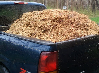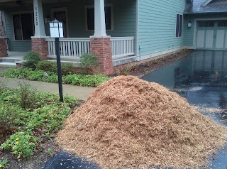 After my "resting" days, I got back to task. Since dandelions and other weeds had taken over much of our landscape beds, I figured I better get to those before we could spread the mulch. I hate weeding, but somebody’s gotta do it. Besides getting the weeds out, I also had to use a rake as well as my hands to get as many stray leaves out of the dense groundcover and the bushes. Once the weeds and leaves were cleared out, I was ready to felt like I should tackle the first mulch mountain. I was already tired, but oh well.