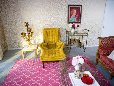 The second layer was to bring the wife's style in. She's an artist, and preferred a more bohemian look. Their combined style was called "Mad Men Bohemian." There are still a lot of basic modern pieces, with some artsy accents layered in, as well as the wallpapered accent wall.