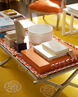 Trays are also big on the decor scene right now, and lots of people are creating DIY versions, like these fabric-covered trays made into a coffee table, which I included in my "crushing on chevron" series.