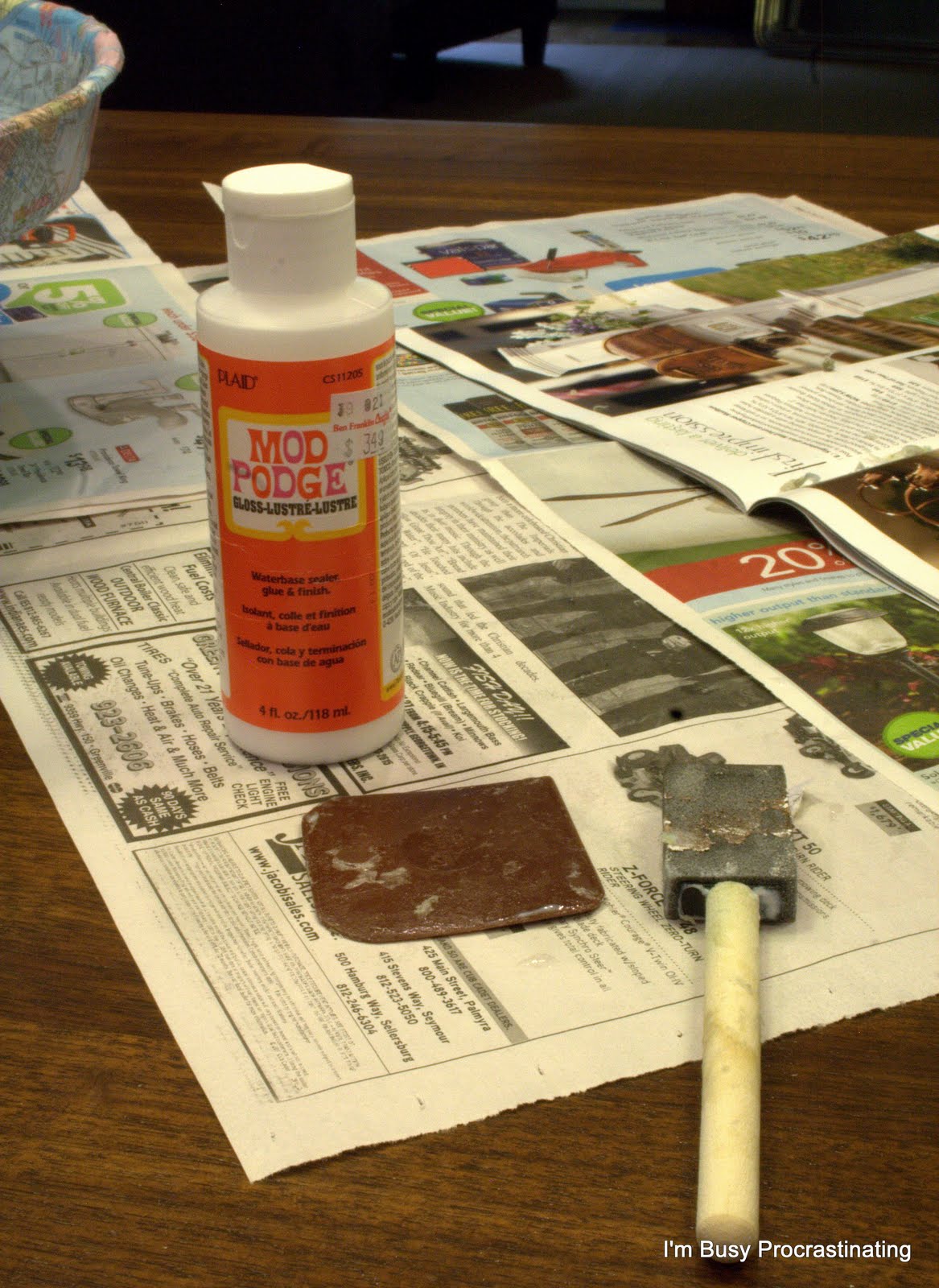 After wiping the whole tray down to get rid of any lingering dirt, I decided to brush Mod Podge all over the tray. Sorry, blurry photo and it's not like I can go back and re-shoot it. But you get the idea.