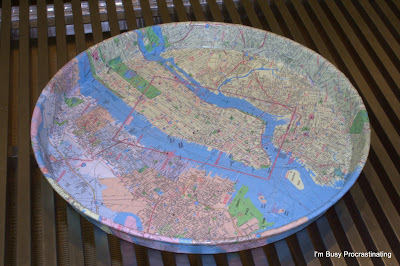 This was my first Mod Podge project ever, and I expected the packaging to give usage instructions, but it really didn't tell me anything. And I was too impatient to look up a tutorial online. So I went for it. Hey, it was a $1.00 tray, a used map and an under-$5.00 bottle of Mod Podge, so I wasn't too uptight about whether it was a success or a flop.