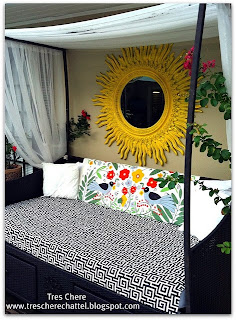 5. How about this cozy outdoor daybed for a relaxing spot? The mix of colors and patterns is along the lines of what I want to do in my living room. I've got a big black leather sectional, but I want to punch it up with color and pattern. The yellow-painted mirror on the wall is just perfect for this space. Check it out at Tres Chere.