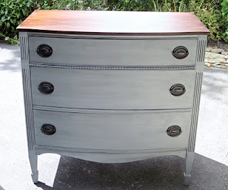 3. This chest looks like a long-lost sibling of our white Hepplewhite dresser. Sue from Uniquely Chic chose a blue-gray color for the base and she re-stained the top deep walnut. Beautiful!