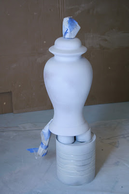 You can see that before I started priming, I covered the cord and the light fixture parts with painter's tape. I also used an old can as well as some lids from spray primer cans to prop up the lamp off the floor so I could get to all its surfaces that would need paint. I actually use spray paint lids a lot to prop up items, like chairs and accessories, off the floor for painting. For heavier items, I use painter's pyramids, because the lids bow and crack under too much weight.