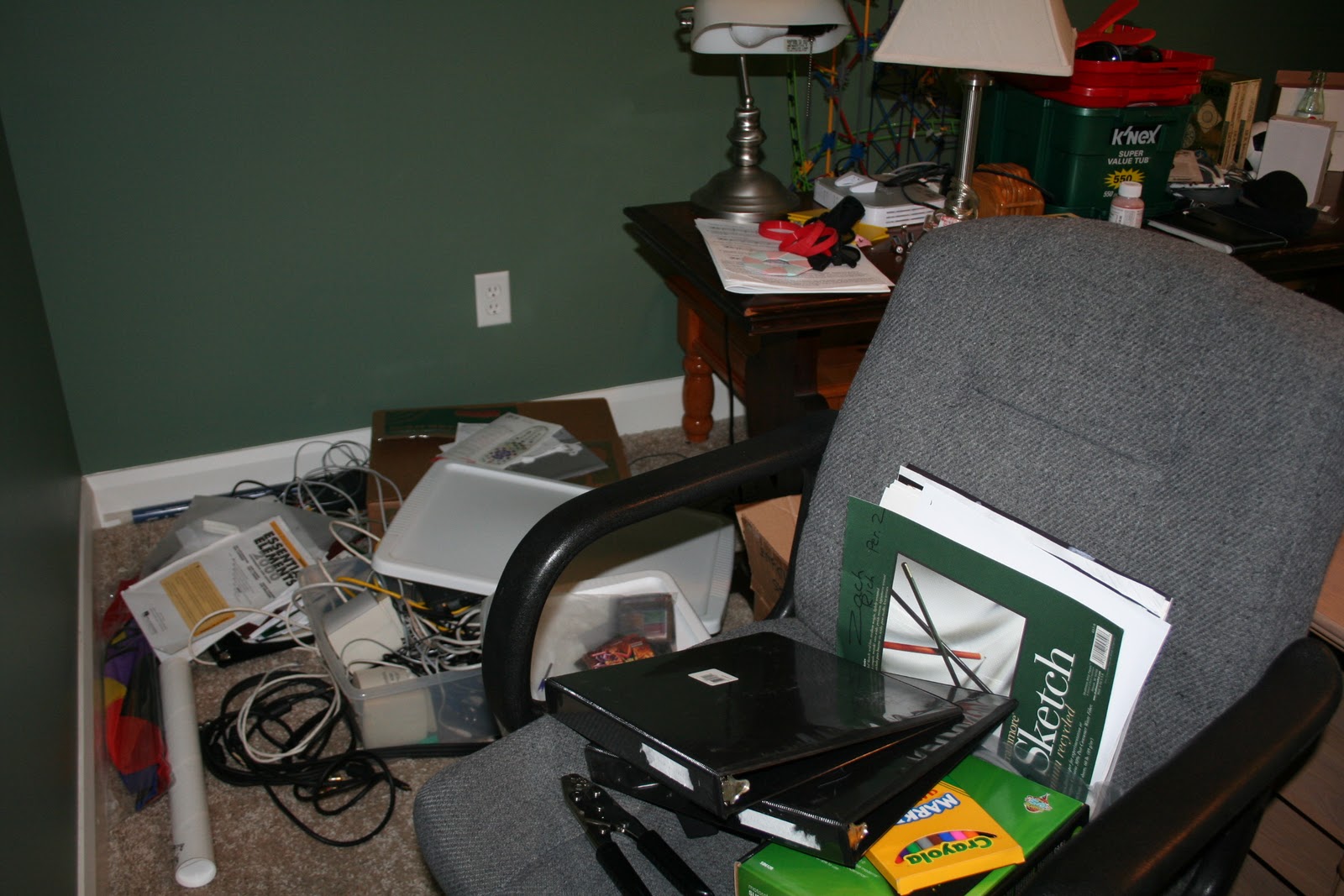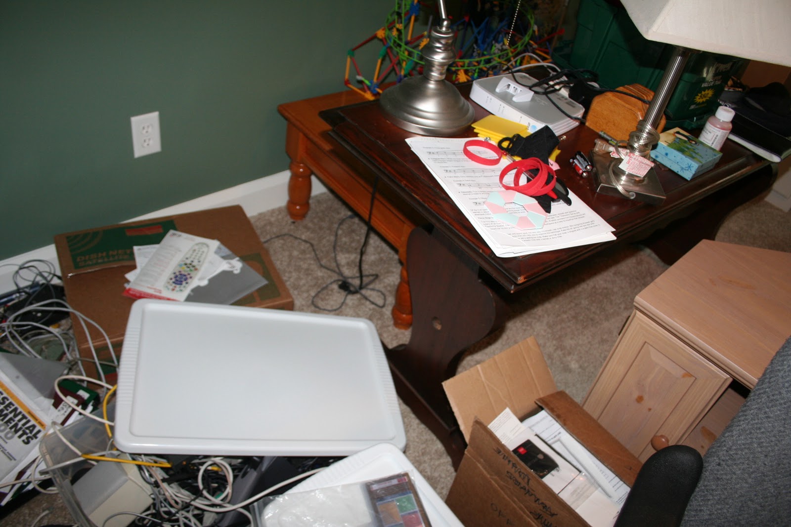 The Mr. dubbed the old bedroom "The Conservatory" because he had visions of The Teen practicing his trombone in there. We didn't need an office any longer, so all the stuff from the former office got moved into The Conservatory, and we were going to go back and sort through everything another time. In addition to all the old office contents, the room also ended up housing all the stuff The Teen didn't feel like moving to his new room. "The Conservatory" should have been dubbed "The Hot Mess."