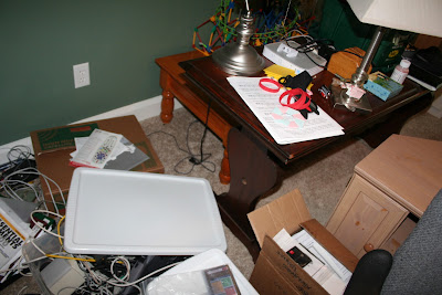 Some of the things that got dumped in The Conservatory were our bins of electronic parts. You see, The Mr. is a technology guy, so he keeps stashes of CAT-5 cables, telephone wires, keyboards, mice, and all kinds of parts and pieces that only he knows what to do with. Those things are usually in bins in our hall closet upstairs, but The Mr. had pulled them out for a re-wiring project, or two, or several, and they never got put back away in the closet, or even back in the bins.