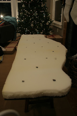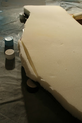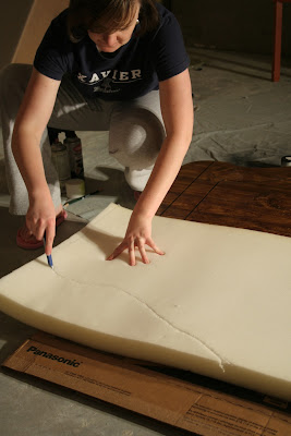 Next I spread my foam out on the ground and sat the headboard on top of it. I traced around the headboard shape onto the foam.