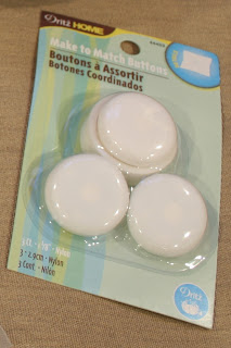 At some point, you have to create your buttons. I used these decorator button-making kits, which I purchased at JoAnn's. Just follow the instructions on the back of the package. They were easy to make, but time consuming. The more tufts you have, the more buttons you need, so plan for how much fabric you'll need.