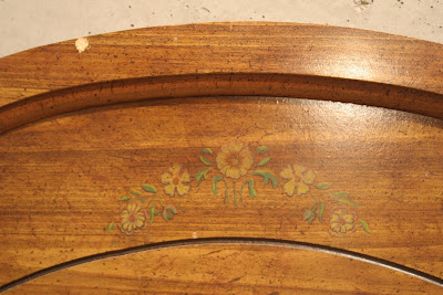 The first thing I did was remove the molding across the top middle of the headboard, so it would be flat rather than three-dimensional. Then I removed the legs and stored them.