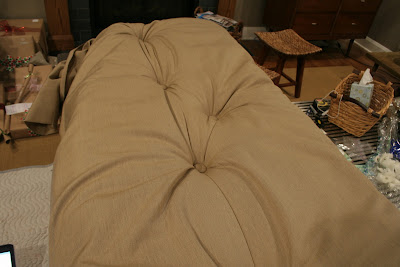 After all the buttons were made, I draped the fabric across the headboard, leaving an equal amount of overlap on all sides. It was then time to start tufting. It's best to start at the very center, so you can keep things lined up as you go along.