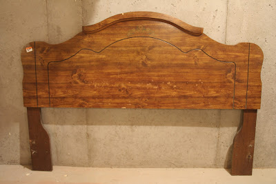 I had assumed I would buy some MDF at the hardware store, and cut it into a fun shape with a jigsaw. But what did I find on a quick stop by my local Goodwill? A perfectly shaped queen-size faux-wood headboard, just screaming to be upcycled.